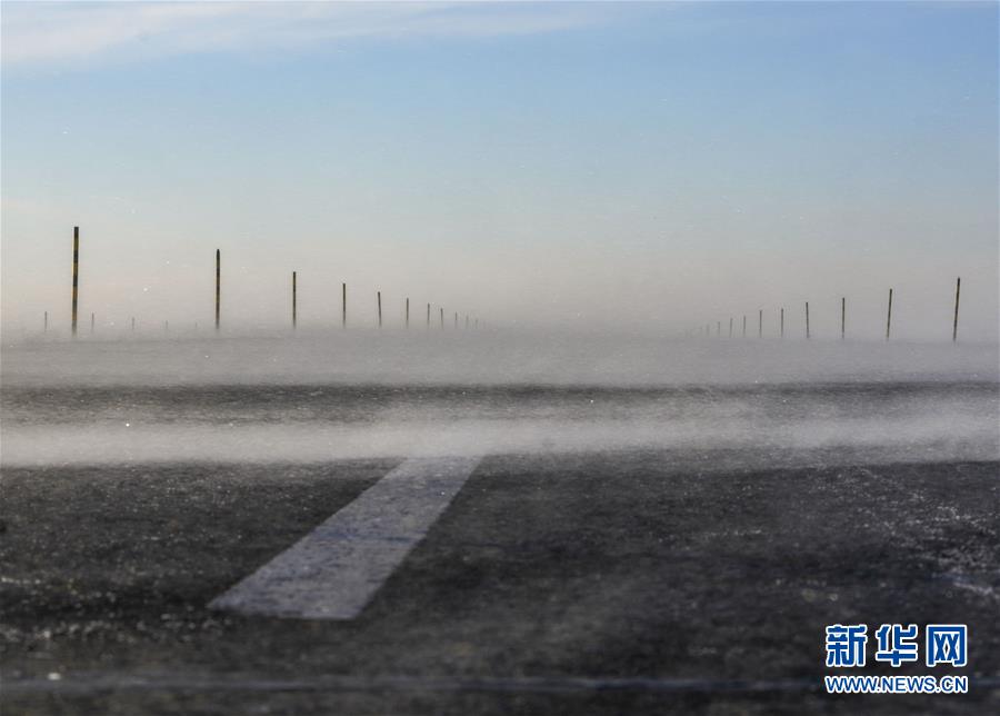 在新疆玛依塔斯风区内,公路上大风卷起细雪飘散开来(1月13日摄)。 玛依塔斯风区位于新疆西北部额敏县境内。这里东西风交替频繁,一年大风天数超过150天,是世界上罕见的暴风雪灾害地段。驻守在这里的新疆塔城公路管理局额敏分局玛依塔斯应急保障基地,近年来连续装备抛雪机等冰雪抢险救灾装备,有力地保障了这条道路的交通安全。 新华社记者赵戈摄