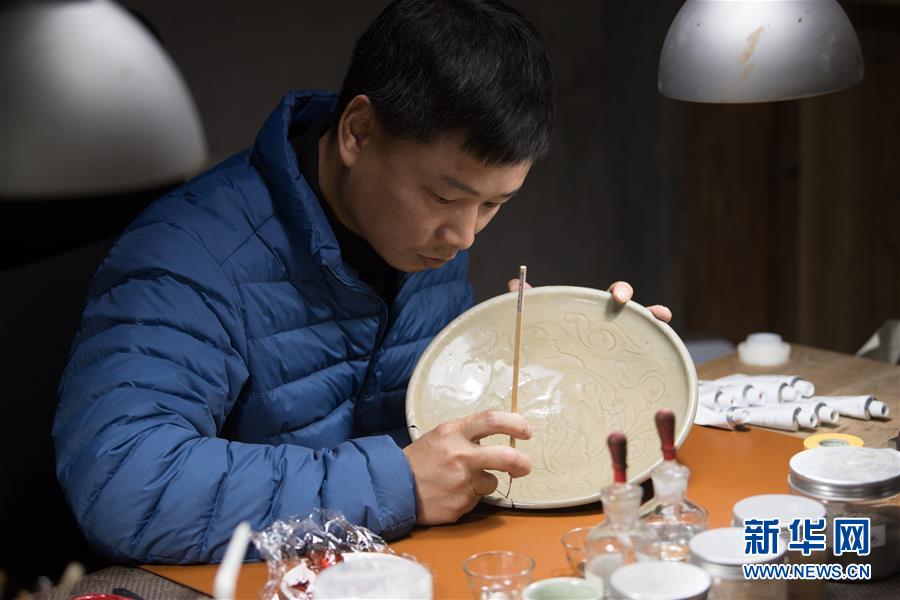 1月15日,吴荣强在龙泉市牛头岭村“七分醉”工作室对一件青瓷器皿进行漆缮。
