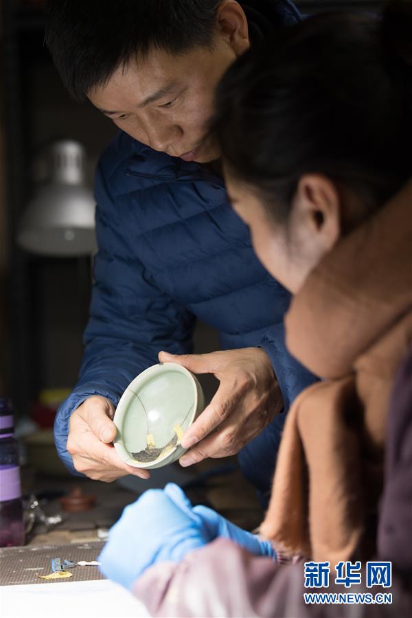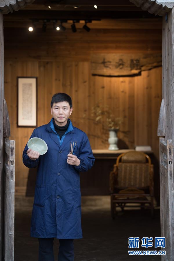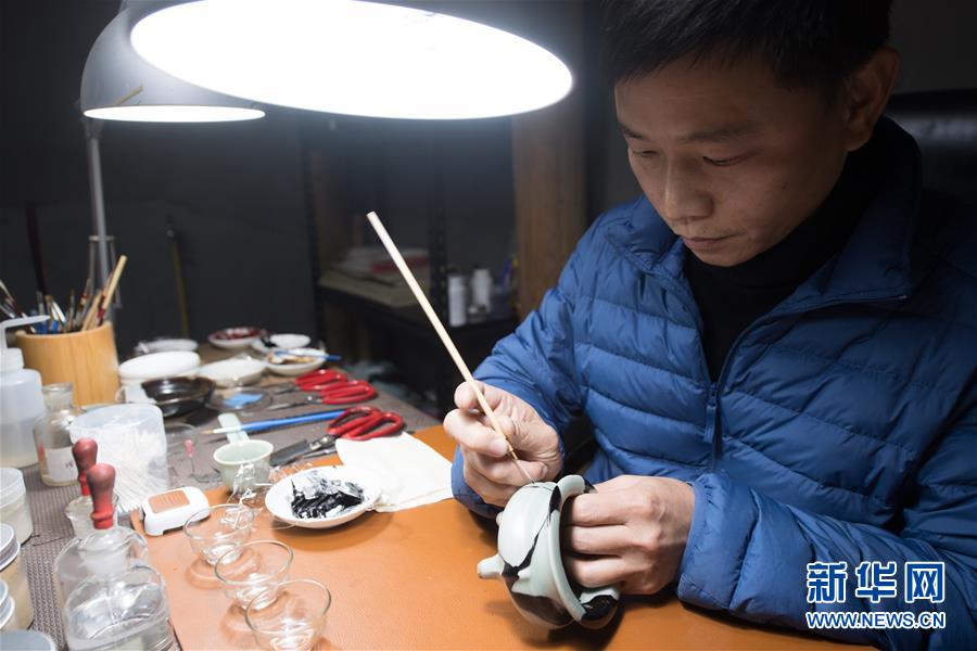 1月15日,吴荣强在龙泉市牛头岭村“七分醉”工作室对一件青瓷器皿进行漆缮。 新华社记者翁忻旸摄