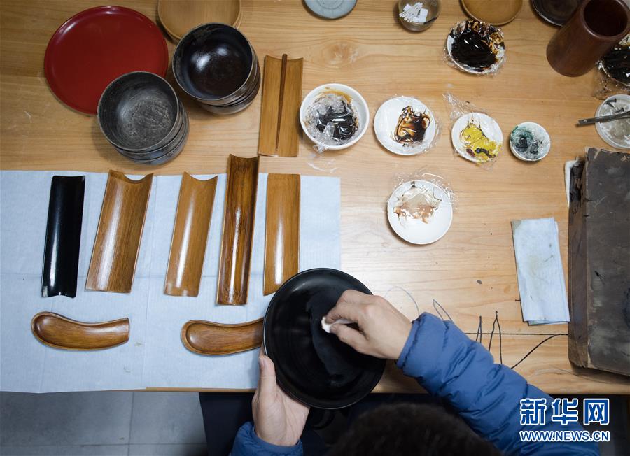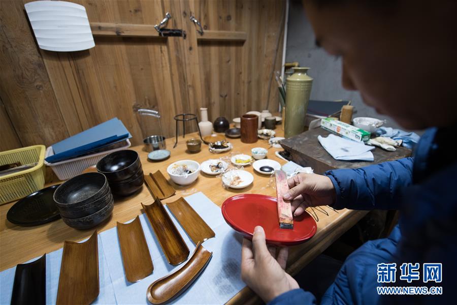 1月15日,吴荣强在龙泉市牛头岭村“七分醉”工作室制作漆器。新华社记者翁忻旸摄