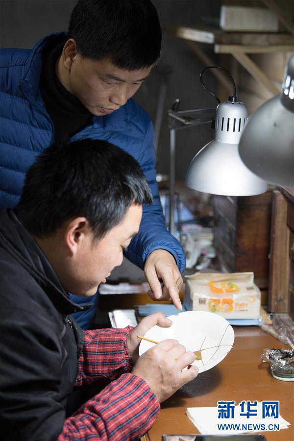 1月15日,在龙泉市牛头岭村“七分醉”工作室,吴荣强(上)指导一名徒弟进行漆缮。 新华社记者翁忻旸摄