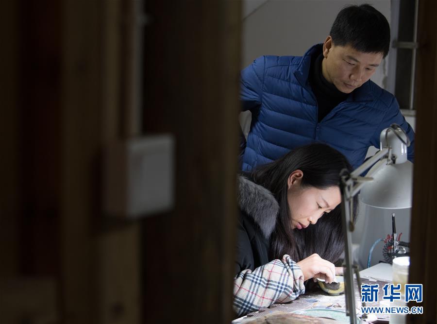 1月15日,吴荣强和妻子李淑敏在龙泉市牛头岭村“七分醉”工作室对一件漆缮器皿进行打磨。吴荣强将工作室搬回龙泉后,原本从事设计行业的妻子也辞职加入工作室的日常工作。 新华社记者翁忻旸摄