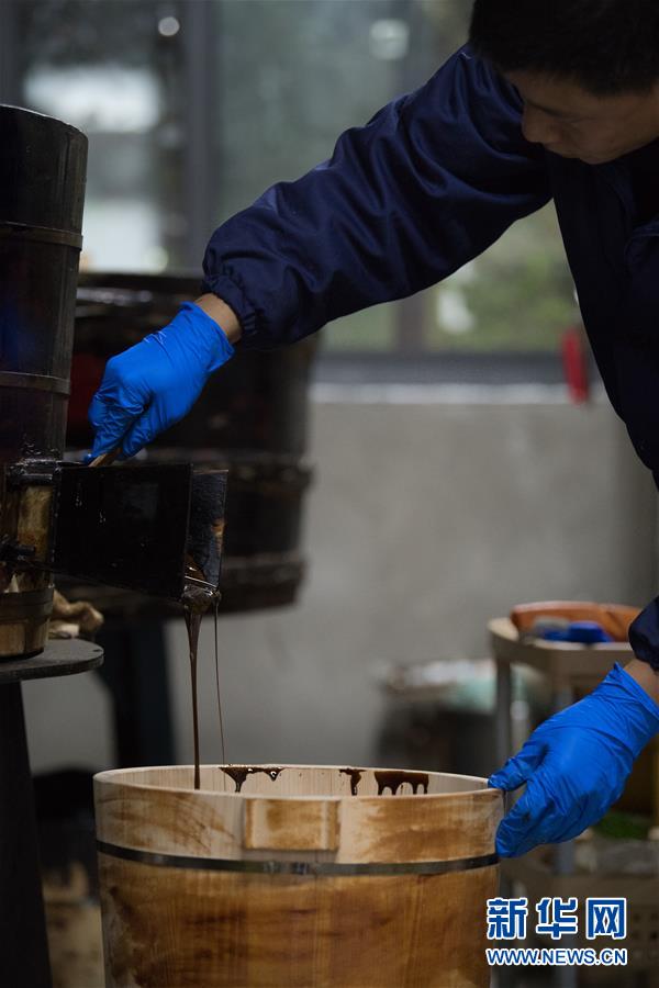 1月15日,吴荣强在龙泉市牛头岭村“七分醉”工作室滤漆。 新华社记者翁忻旸摄