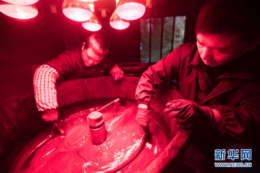 1月15日,吴荣强(右)和徒弟在龙泉市牛头岭村“七分醉”工作室晒漆。 新华社记者翁忻旸摄