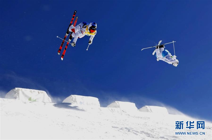 这是运动员在张家口市崇礼区太舞滑雪场参加自由式滑雪雪上技巧世界杯比赛(2018年12月16日摄)。