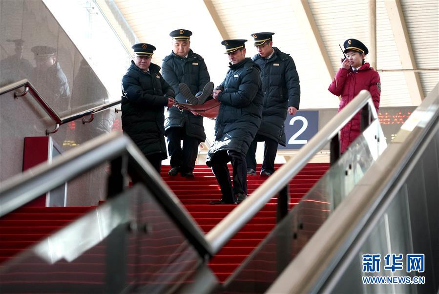 1月16日,鹤壁东站的职工在进行列车下交重伤病旅客应急演练。 当日,中国铁路郑州局集团有限公司新乡车务段鹤壁东站组织职工开展服务礼仪、手语等业务培训,并进行非正常情况应急演练,为2019年春运做准备。 新华社记者李安摄