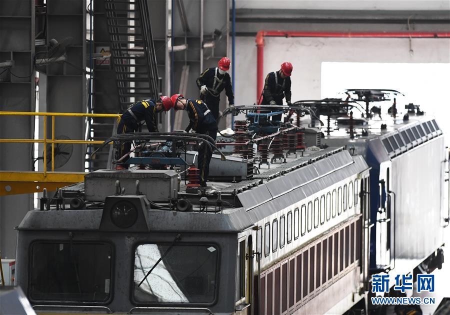 1月16日,重庆机务段职工在对机车车顶设备进行检修。 临近春运,为确保春运旅客和货物列车运输安全,中国铁路成都局集团有限公司重庆机务段对全段机车进行专项检查、整修,为即将到来的春运做准备。 新华社记者王全超摄