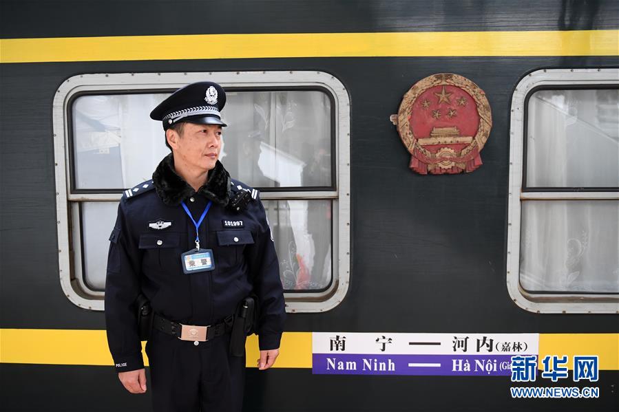 1月1日,在广西南宁火车站,杨铁鸣在刚刚从越南河内(嘉林)开来的列车旁值勤。杨铁鸣是第一趟中越国际客运列车的当班乘警,现在依然在这趟列车上值守。 新华社记者陆波岸摄