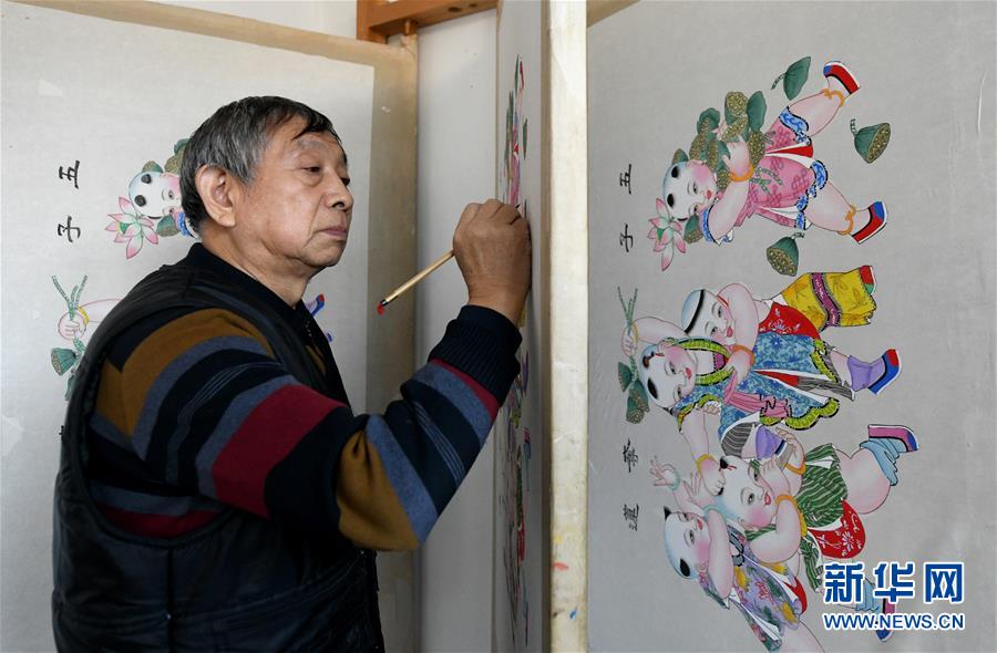 1月16日,霍庆顺在彩绘年画《五子夺莲》。