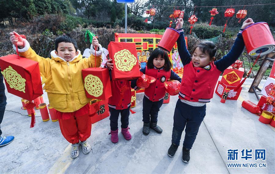 1月16日,孩子们展示用废旧物品制作的环保节日花灯。 临近春节,浙江省长兴县开发区中心幼儿园的老师和孩子们来到长兴县太湖街道下属的新塘村,为村民表演文艺节目,用喜庆的传统舞蹈营造节日气氛。另外孩子们还用纸盒、瓶子、彩色包装纸等废旧物品制作了环保花灯,送给村民,倡导低碳环保的节日新风。 新华社记者 徐昱 摄
