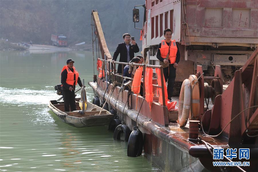 1月22日,何银祥(左)在驾驶小船,他驾驶的小船是大船的动力来源。 新华社记者 欧东衢 摄
