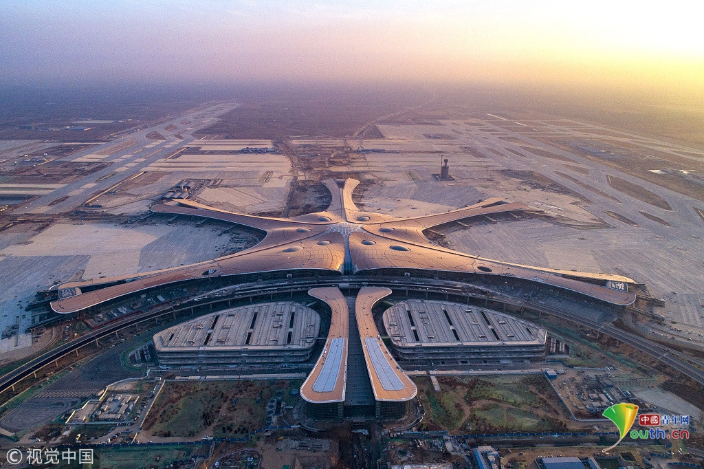 2018年12月19日,北京大兴国际机场航站楼的屋面已基本完工,一只金色“凤凰”完整地出现在北京城南。视觉中国
