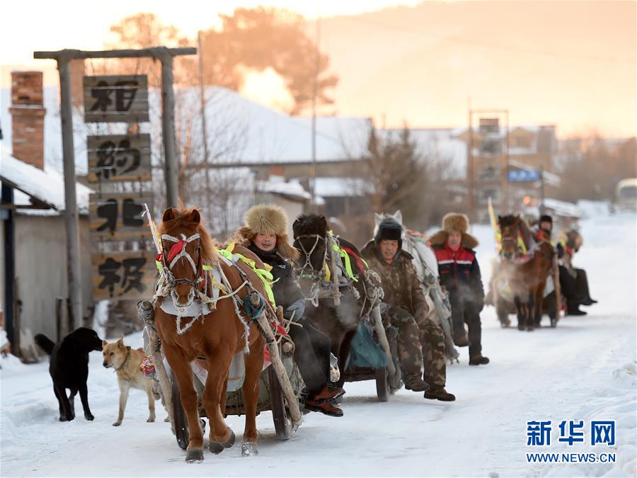 1月25日,在黑龙江省漠河市北极村,马爬犁载着游客去神州北极广场“找北”。
