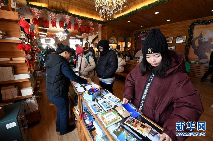 1月24日,在黑龙江省漠河市北极村邮政局,游客在挑选明信片。该邮政局是我国最北的邮政局。新华社记者王毓国摄