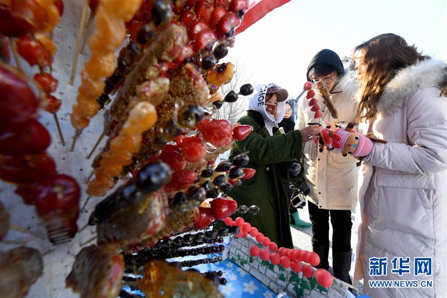 1月24日,在黑龙江省漠河市北极村,顾客在“最北糖葫芦”摊买糖葫芦。新华社记者王毓国摄