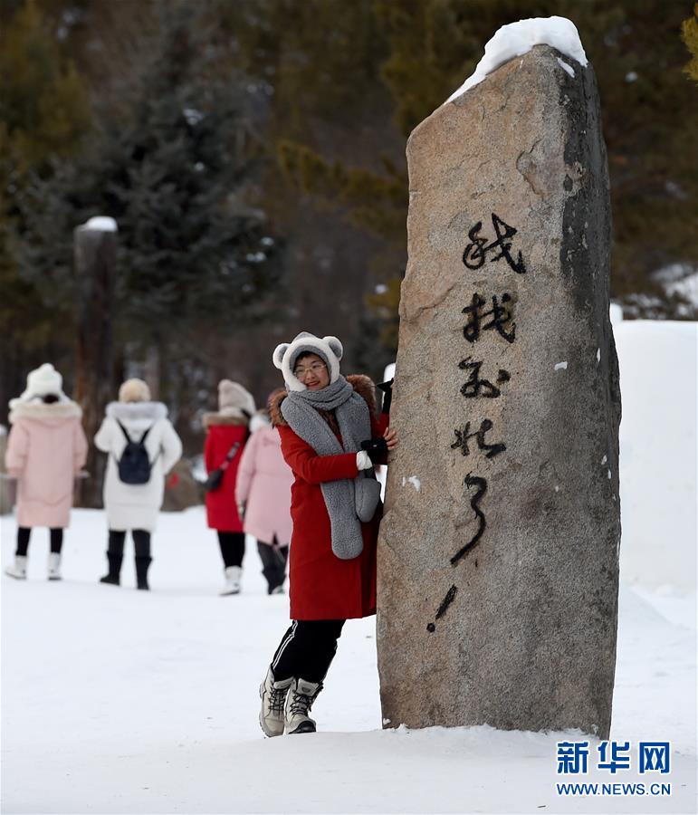 1月24日,在黑龙江省漠河市北极村,游客在“我找到北了”石碑旁留影。新华社记者王毓国摄