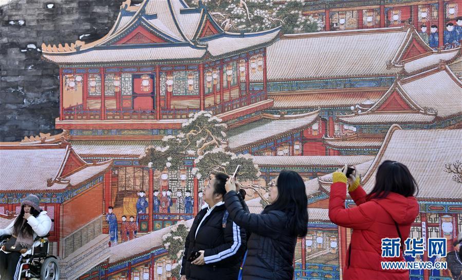 1月25日,游人在故宫内拍摄古代宫廷过春节的绘画。 春节将至,北京故宫博物院内张灯结彩,到处悬挂着宫灯、万寿灯、年画、门神、福字等古代宫廷节日装饰品,让来自国内外的游人感受到浓浓的年味。 新华社记者 李欣摄