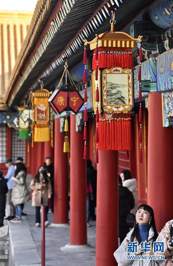 这是在故宫内拍摄的古代宫廷节日装饰品(1月25日摄)。 春节将至,北京故宫博物院内张灯结彩,到处悬挂着宫灯、万寿灯、年画、门神、福字等古代宫廷节日装饰品,让来自国内外的游人感受到浓浓的年味。 新华社记者 李欣摄