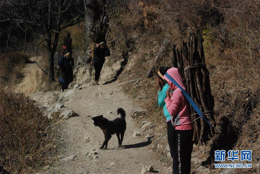 1月25日,在云南省兰坪县,余永妹(左一)与孩子们背柴回家。