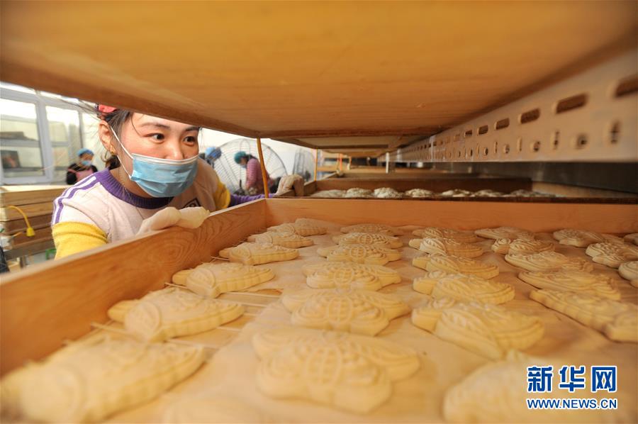 1月31日,河北黄骅市一家面花作坊的工人在查看面花。 河北黄骅市有着过年蒸面花的习俗。春节前夕,当地面花制作工厂加班加点制作面花,供应春节市场。 新华社记者牟宇摄