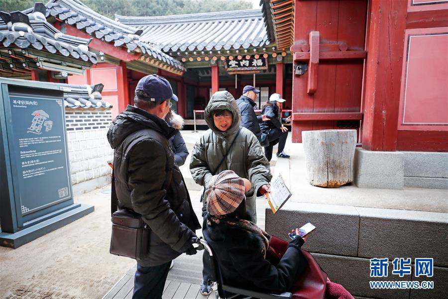 2月6日,在韩国水原市,几名中国游客在水原华城行宫内研究导览图。 虽然中国人过春节的传统是返乡回家,但越来越多的国人选择在春节期间走出国门,利用春节假期外出旅游。 新华社记者 王婧嫱 摄