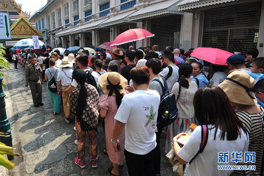 2月4日,在泰国曼谷的大皇宫外,中国游客排队等待参观。 虽然中国人过春节的传统是返乡回家,但越来越多的国人选择在春节期间走出国门,利用春节假期外出旅游。 新华社发(拉亨 摄)