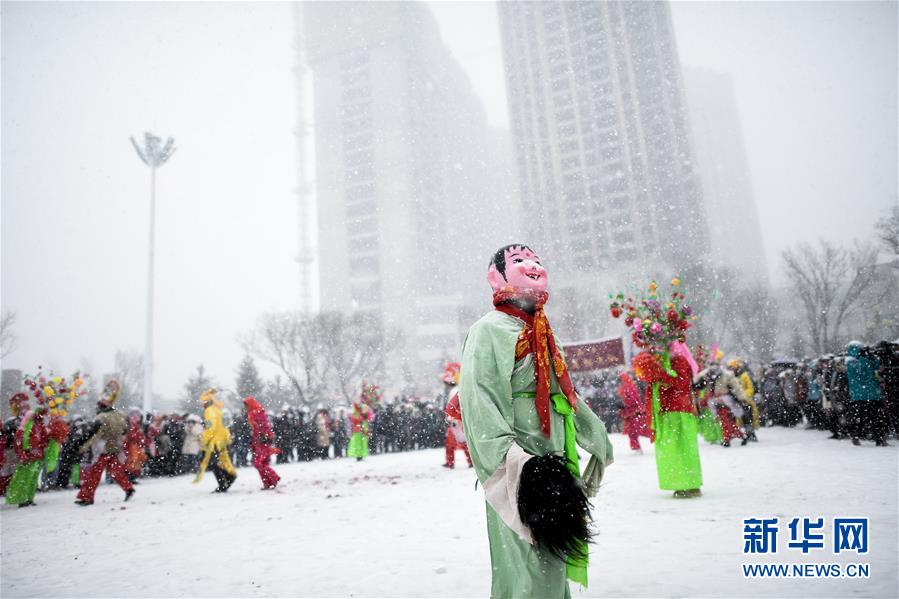 2月16日,社火队演员在青海省大通回族土族自治县文化广场表演。