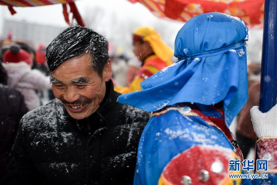 2月16日,群众在青海省大通回族土族自治县文化广场冒雪观看社火表演。新华社记者吴刚摄