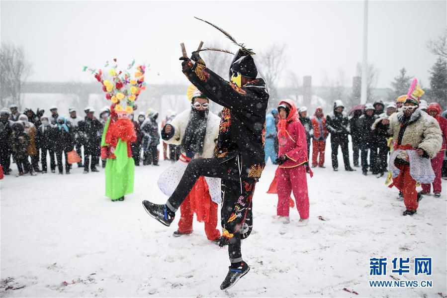 2月16日,社火队演员在青海省大通回族土族自治县文化广场表演。新华社记者吴刚摄