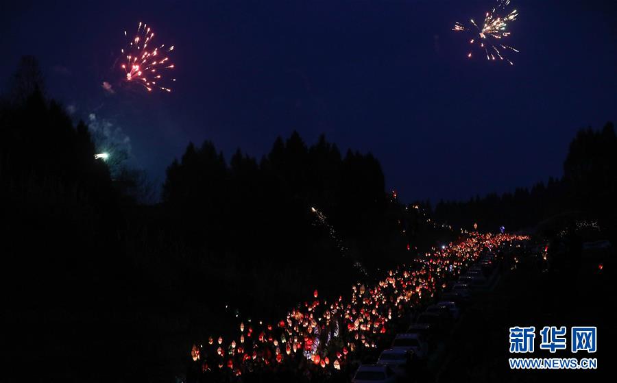 2月18日,群众在四川省南充市嘉陵区金宝镇点亮“蛴蟆灯”。 当日是农历正月十四,夜幕降临后,川渝等地数万名群众在四川省南充市嘉陵区金宝镇汇聚,点亮“蛴蟆灯”,敲着锣鼓唱着歌谣,将“蛴蟆”送到几公里外的田边或者河边烧掉,祈福健康平安。星星点点的灯光在乡间小路闪烁移动,场面壮观热烈。 “送蛴蟆”祈福这一习俗源于清朝,历经演变成为川东北地区一个古老而神秘的地方民俗节日。 新华社记者 江宏景 摄