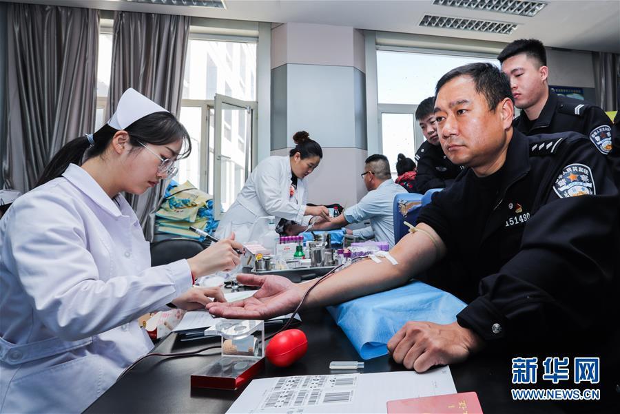 2月24日,在锡林郭勒盟中心血站,内蒙古锡林郭勒边境管理支队民警在献血。 内蒙古自治区锡林郭勒盟“2·23”重大事故伤者正在锡林郭勒盟医院、锡林郭勒盟蒙医医院接受救治。因用血需求量大,当地血库库存一度低于警戒线。在当地政府倡议下,各单位职工、市民纷纷前往锡林郭勒盟中心血站献血。截至24日16时,已有220余名志愿者完成献血,采集全血6.8万毫升,机采血小板9个治疗量。 新华社记者 刘懿德 摄