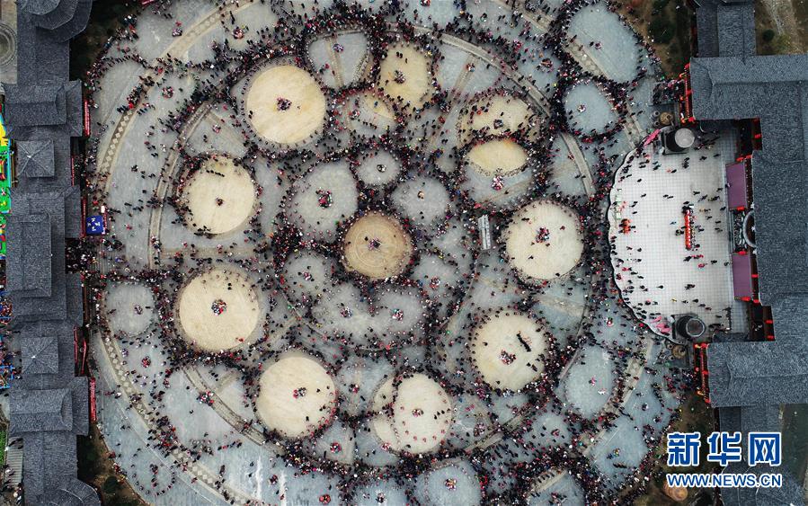 2月24日,在贵州省凯里市舟溪镇,苗族群众在跳芦笙舞(无人机拍摄)。 当日,在贵州省黔东南苗族侗族自治州凯里市舟溪镇,来自各地的苗族群众身着节日盛装,欢聚在古老的“甘囊香”芦笙堂,男子吹奏起芦笙,姑娘和孩子们跳起芦笙舞,欢度新春,祈求风调雨顺、五谷丰登,青年男女也借此良日寻觅意中人。 “甘囊香”是苗语音译,意思为“河流的下游,神仙汇聚的地方”。“甘囊香”芦笙会是贵州规模最大、最古朴的苗族芦笙会之一。 新华社记者杨文斌摄