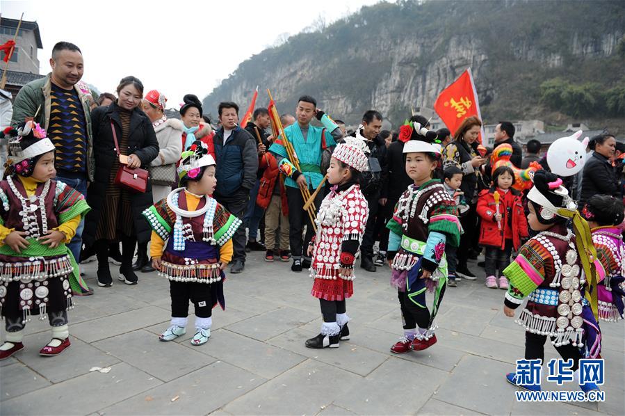 2月24日,在贵州省凯里市舟溪镇,苗族小姑娘身着盛装跳芦笙舞。 当日,在贵州省黔东南苗族侗族自治州凯里市舟溪镇,来自各地的苗族群众身着节日盛装,欢聚在古老的“甘囊香”芦笙堂,男子吹奏起芦笙,姑娘和孩子们跳起芦笙舞,欢度新春,祈求风调雨顺、五谷丰登,青年男女也借此良日寻觅意中人。 “甘囊香”是苗语音译,意思为“河流的下游,神仙汇聚的地方”。“甘囊香”芦笙会是贵州规模最大、最古朴的苗族芦笙会之一。 新华社记者杨文斌摄