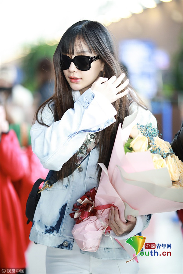 2019年2月24日,上海,杨颖现身机场。她全白套装现身身材十分纤细,手捧粉丝送的花与小粉丝合影,十分亲切。