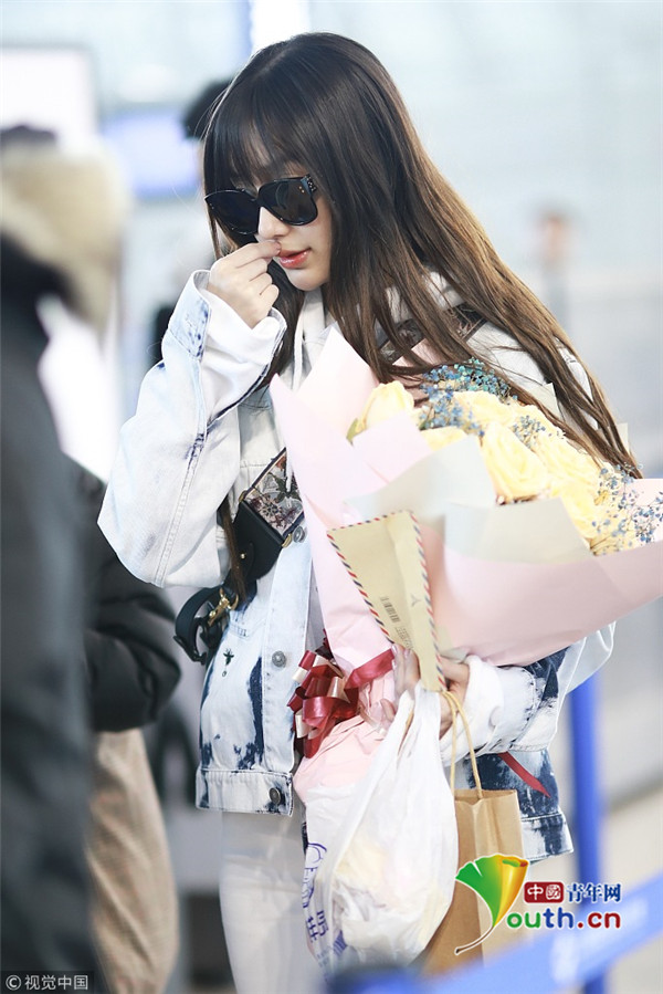 2019年2月24日,上海,杨颖现身机场。她全白套装现身身材十分纤细,手捧粉丝送的花与小粉丝合影,十分亲切。