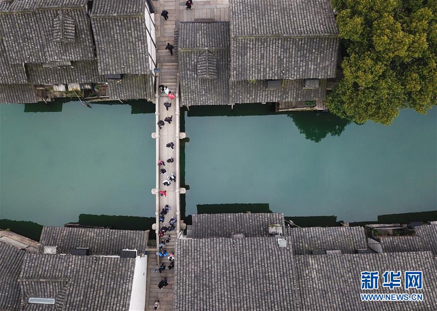2月25日,游人在乌镇游览观光(无人机拍摄)。 随着气温升高,浙江省桐乡市乌镇景区春意萌动。 新华社记者翁忻旸摄
