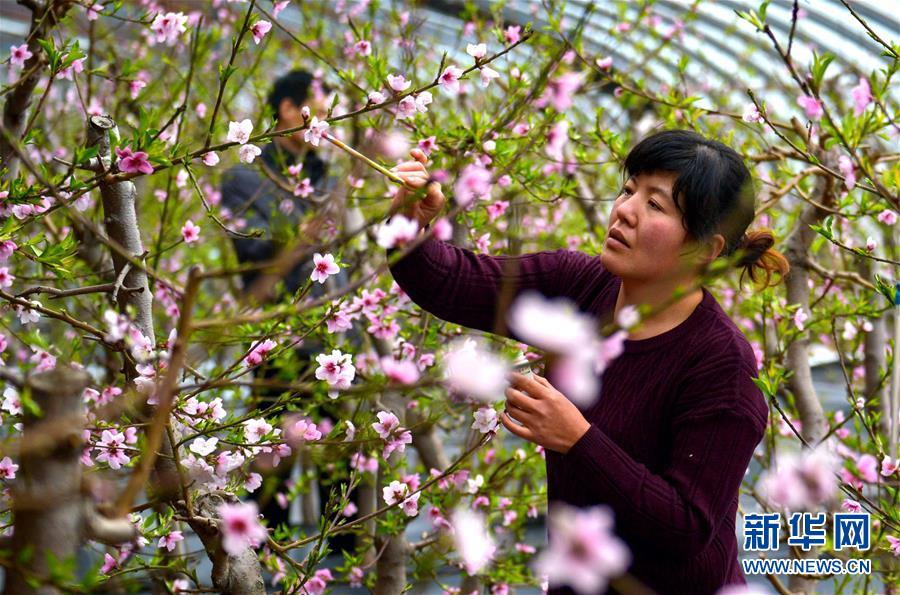 2月25日,果农在邯郸市邯山区硕果春农业园大棚内为桃花授粉。 随着气温升高,河北省邯郸市邯山区硕果春农业园大棚内的桃花竞相绽放。 新华社记者 王晓 摄