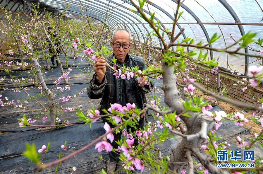 2月25日,果农在邯郸市邯山区硕果春农业园大棚内为桃花授粉。 随着气温升高,河北省邯郸市邯山区硕果春农业园大棚内的桃花竞相绽放。 新华社记者 王晓 摄