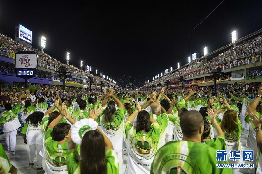 3月3日,在巴西里约热内卢,特级组桑巴舞校工作人员参加狂欢节游行。 3月3日晚,2019年里约热内卢狂欢节特级组桑巴舞校在桑巴大道开始花车巡游表演。 新华社记者李明摄