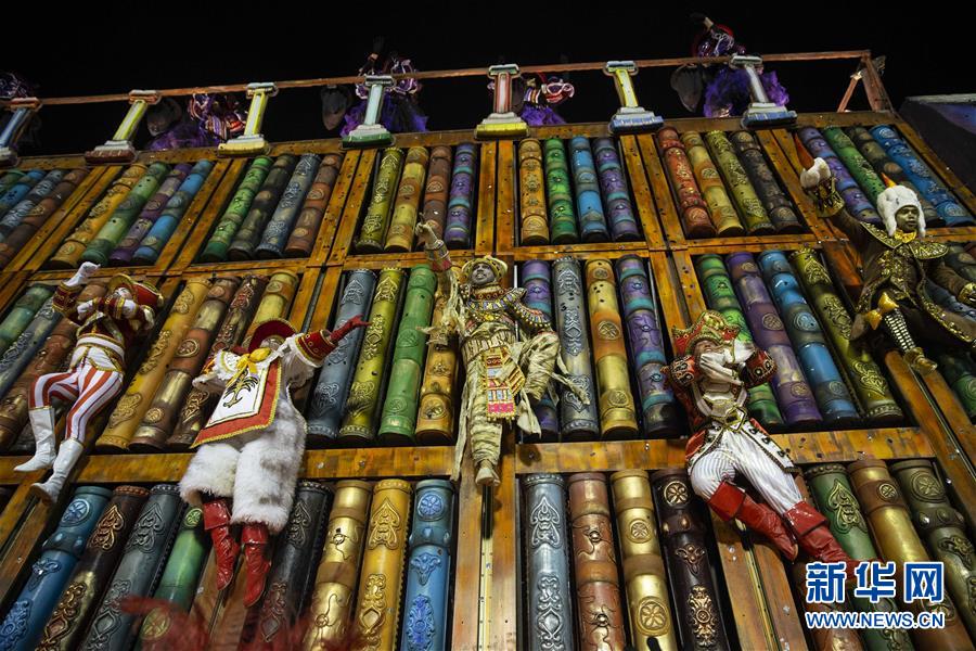 3月3日,在巴西里约热内卢,特级组桑巴舞校演员参加狂欢节游行。 3月3日晚,2019年里约热内卢狂欢节特级组桑巴舞校在桑巴大道开始花车巡游表演。 新华社记者李明摄