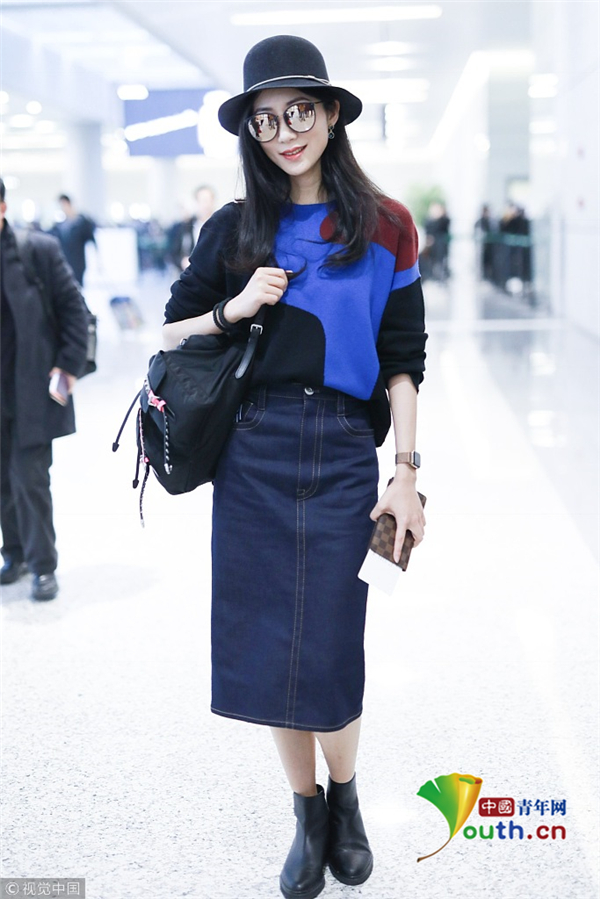 3月4日,上海,韩雪现身机场。她戴着圆帽和镭射墨镜,身穿拼色毛衣,尽显优雅名媛范。