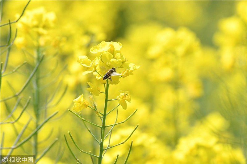 2019年3月1日,蜜蜂在油菜花田里采蜜。近日,位于云南省安宁市的大片油菜花进入盛花期,吸引民众到此赏花。