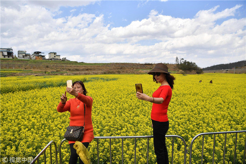 2019年3月1日,游客用手机拍照。近日,位于云南省安宁市的大片油菜花进入盛花期,吸引民众到此赏花。