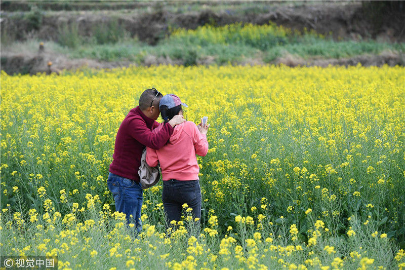 2019年3月1日,游客在花海中拍照。近日,位于云南省安宁市的大片油菜花进入盛花期,吸引民众到此赏花。