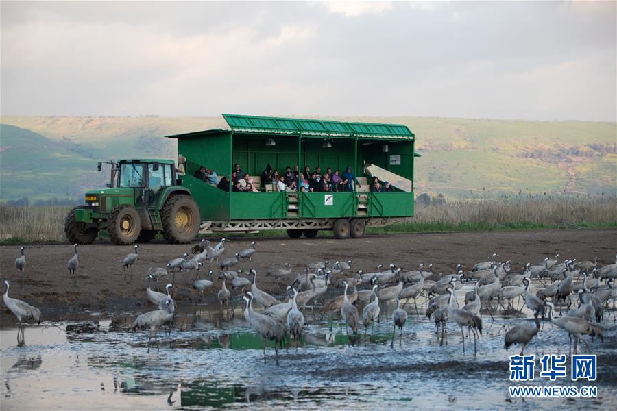 3月7日,在以色列阿格蒙胡拉鸟类和自然公园,游客乘坐拖拉机牵引的观光车观鸟。位于以色列北端的胡拉谷地冬季气候相对温暖湿润,食物来源充足,是候鸟在欧洲和非洲之间迁徙的重要中转站。20世纪90年代,当地农民、以色列农业部和自然保护组织共同设立阿格蒙胡拉鸟类和自然公园,在指定的地点给候鸟喂食,既能保护周边农田的庄稼不被候鸟啄食,又能为迁徙的候鸟补充之后旅程所需的能量,成为候鸟“加油站”。新华社记者郭昱摄