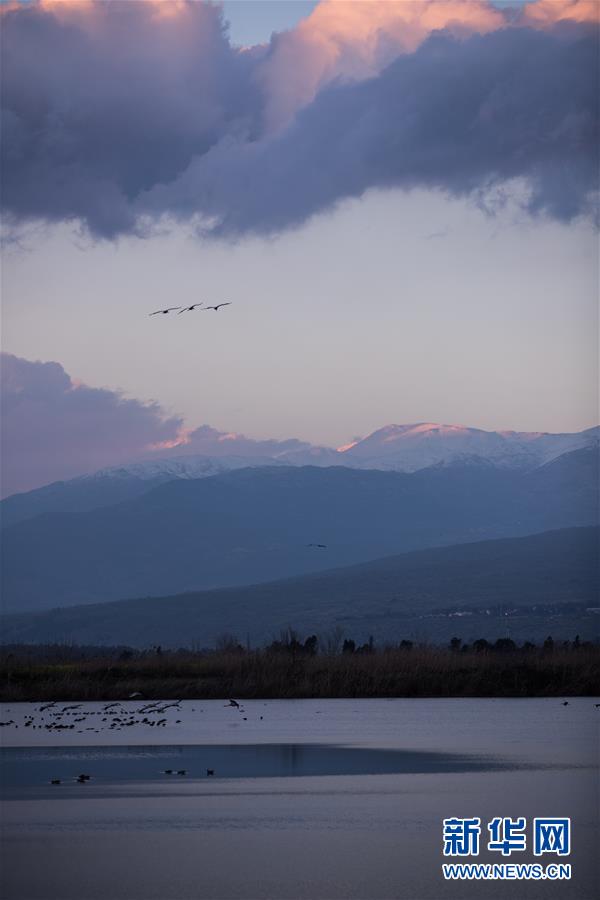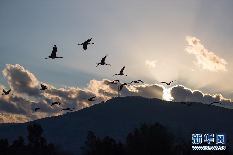 3月7日,在以色列阿格蒙胡拉鸟类和自然公园,几只灰鹤在天空中飞翔。新华社记者郭昱摄