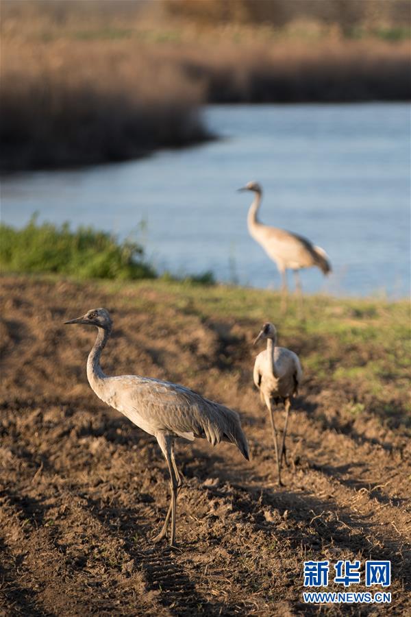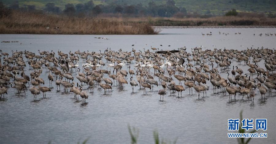 3月7日,在以色列阿格蒙胡拉鸟类和自然公园,几只灰鹤在水边休息。新华社记者郭昱摄