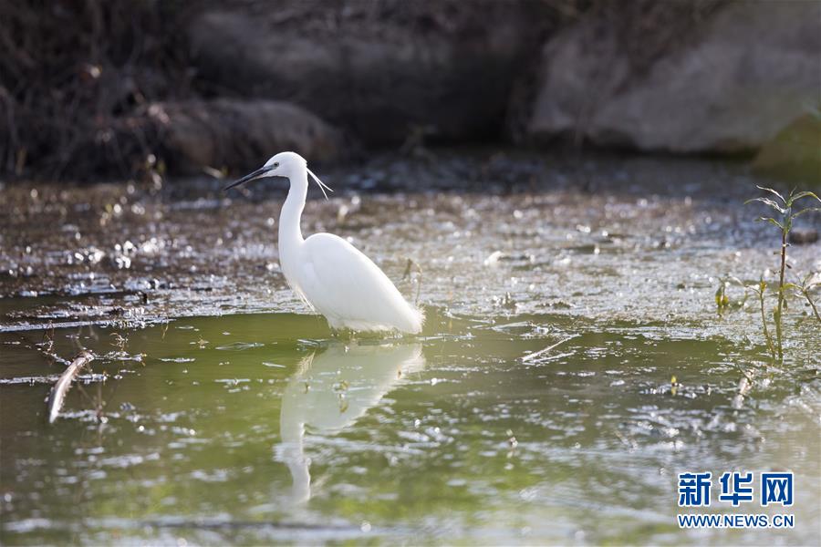 3月7日,在以色列阿格蒙胡拉鸟类和自然公园,一只白鹭在觅食。新华社记者郭昱摄
