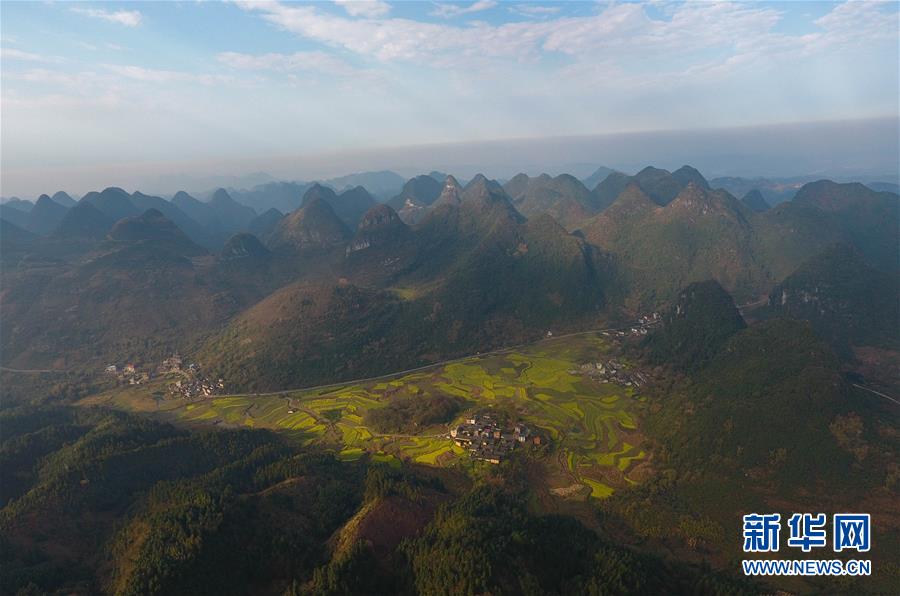 广西融安县东起乡长丰村的田园春色(3月10日无人机拍摄)。 近日,随着气温持续回升,广西融安县境内的油菜花开放,春意盎然。 新华社记者 黄孝邦 摄