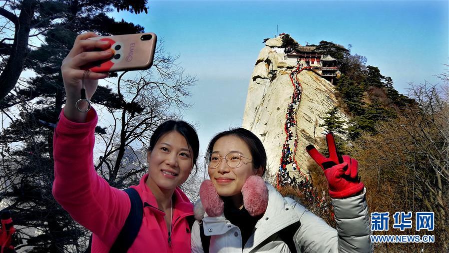 3月9日,游人在华山游览拍照。 随着气温回升,陕西著名风景区华山进入旅游旺季。 新华社记者 陶明 摄